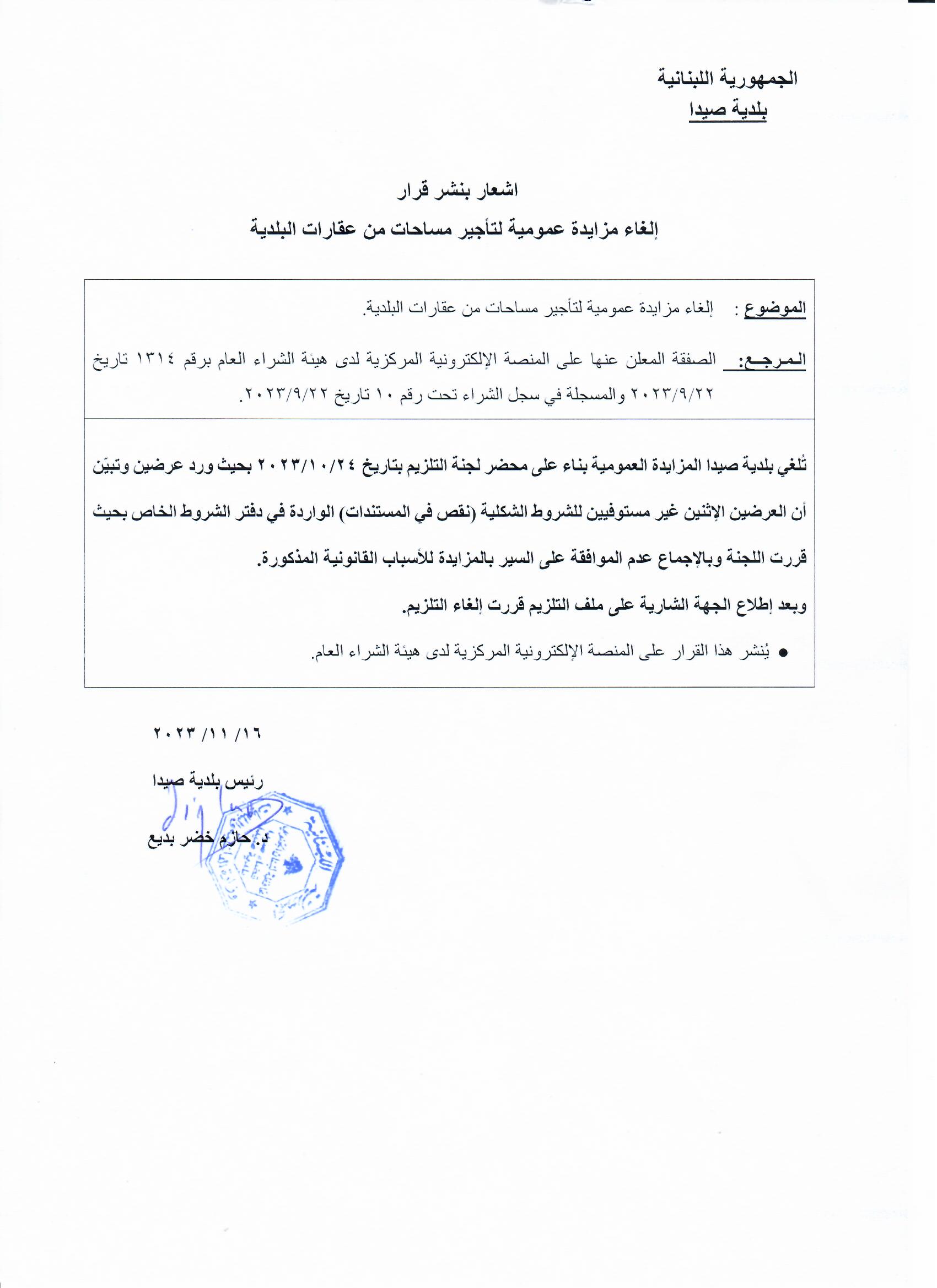 مزايدة عمومية لتلزيم إستئجار أربعة أقسام من العقار رقم 375/ وسطاني العائد لبلدية صيدا لفترة ثلاث سنوات قابلة للتجديد برضى الطرفين، والمساحات المراد تأجيرها هي كالتالي: قسم رقم /1/ مساحة /2422/م2، قسم رقم /2/ مساحة /1975/م2، قسم رقم /3/ مساحة /1789/م2، قسم رقم /4/ مساحة /1606/م2.