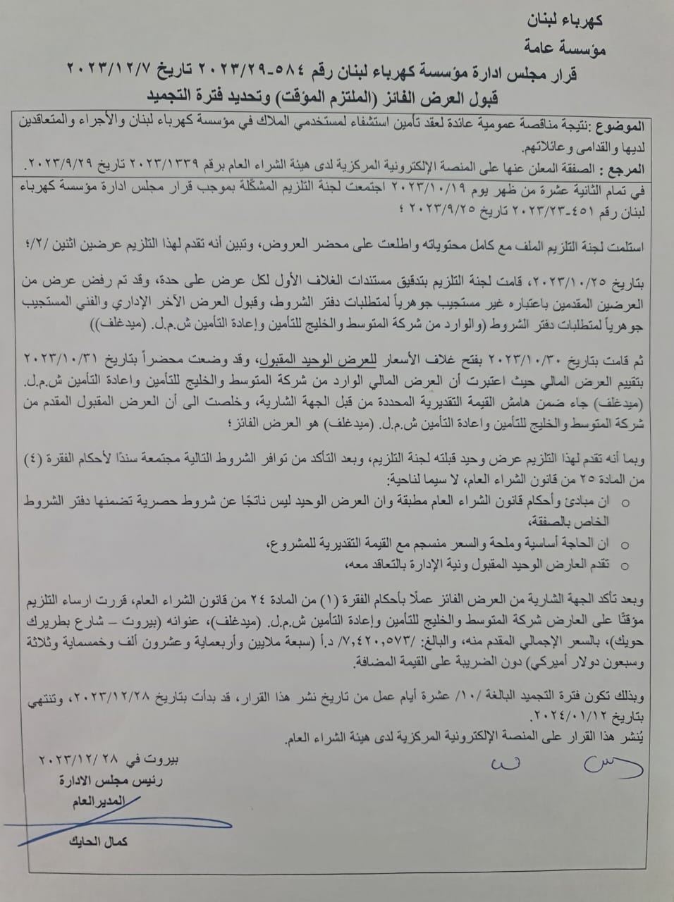 وبعد تأكد الجهة الشارية من العرض الفائز عملًا بأحكام الفقرة (1) من المادة 24 من قانون الشراء العام، قررت ارساء التلزيم مؤقتًا على العارض شركة المتوسط والخليج للتأمين وإعادة التأمين ش.م.ل. (ميدغلف)، عنوانه (بيروت – شارع بطريرك حويك)، بالسعر الإجمالي المقدم منه، والبالغ: /7,420,573/ د.أ (سبعة ملايين وأربعماية وعشرون ألف وخمسماية وثلاثة وسبعون دولار أميركي) دون الضريبة على القيمة المضافة.