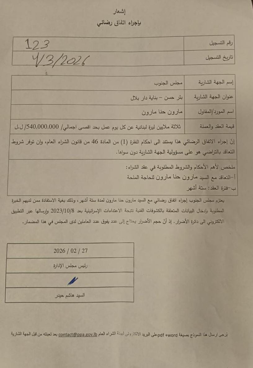 | موضوع الشراء | إشعار بإجراء اتفاق رضائي بين مارون حنا مارون ومجلس الجنوب |