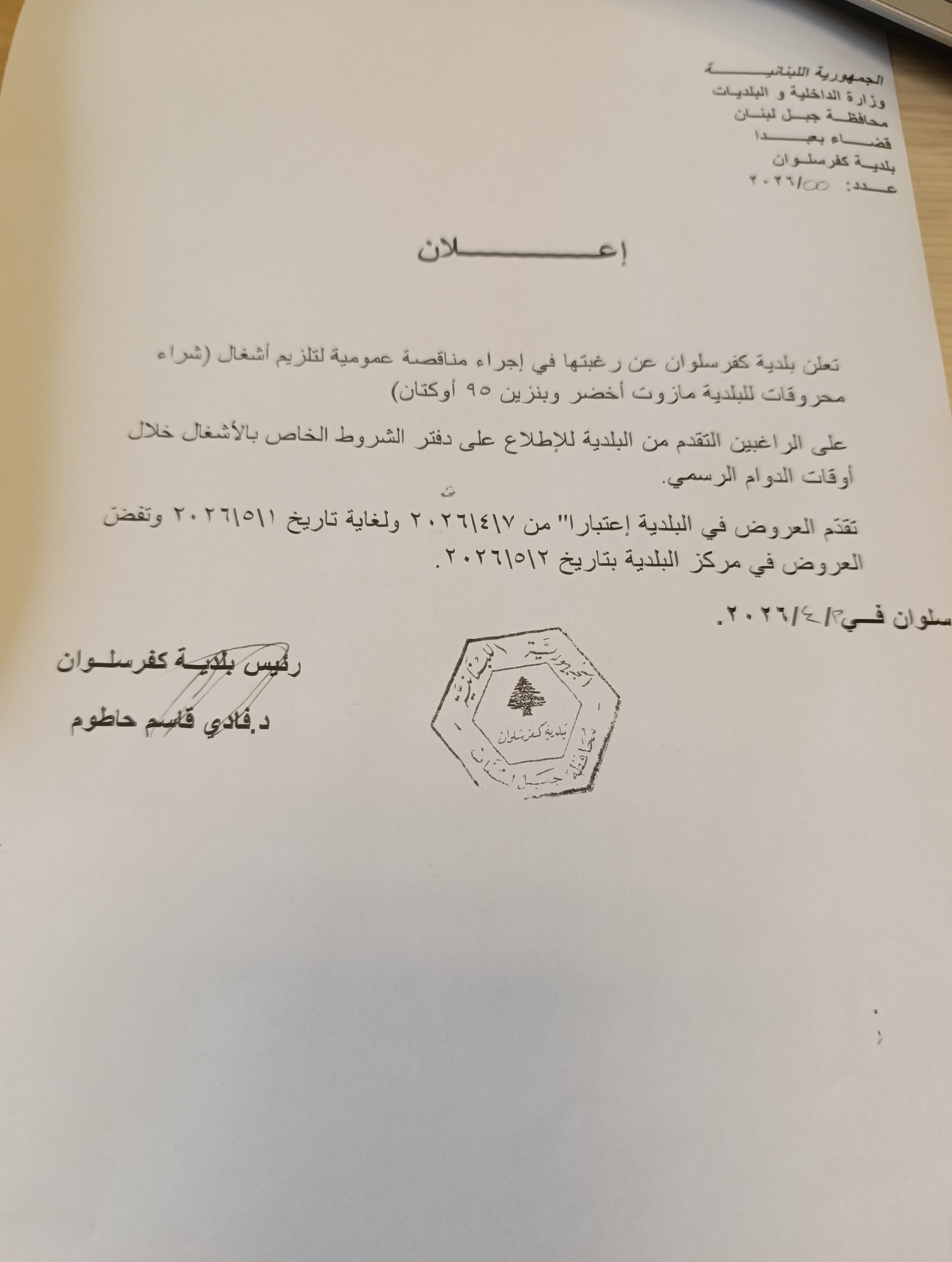 تعلن بلدية كفرسلوان عن رغبتها في إجراء مناقصة عمومية لتلزيم أشغال (شراء محروقات للبلدية مازوت أخضر وبنزين 95 أوكتان) على الراغبين التقدم من البلدية للإطلاع على دفتر الشروط الخاص بالأشغال خلال أوقات الدوام الرسمي.تقدم العروض في البلدية إعتبارا" من 7-4-2026 ولغاية 1-5-2026 وتفضّ العروض في مركز البلدية بتاريخ 2-5-2026.
