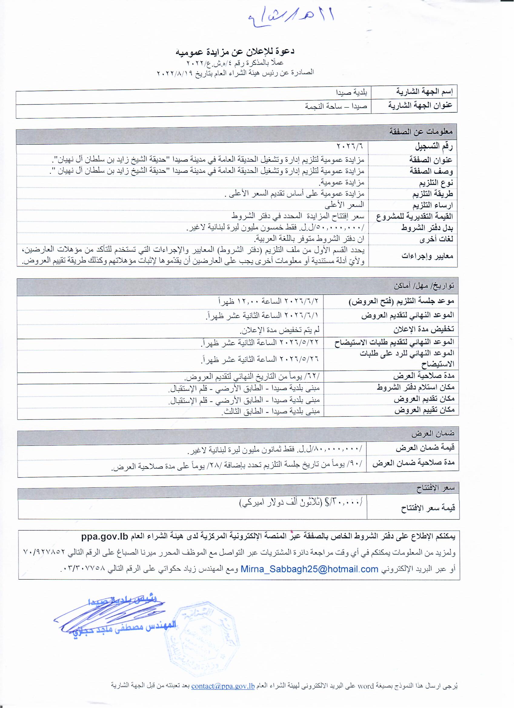 | ملخص الشراء : | تنوي بلدية صيدا اطلاق مزايدة عمومية لتشغيل وادارة حديقة الشيخ زايد بن سلطان ال نهيان |