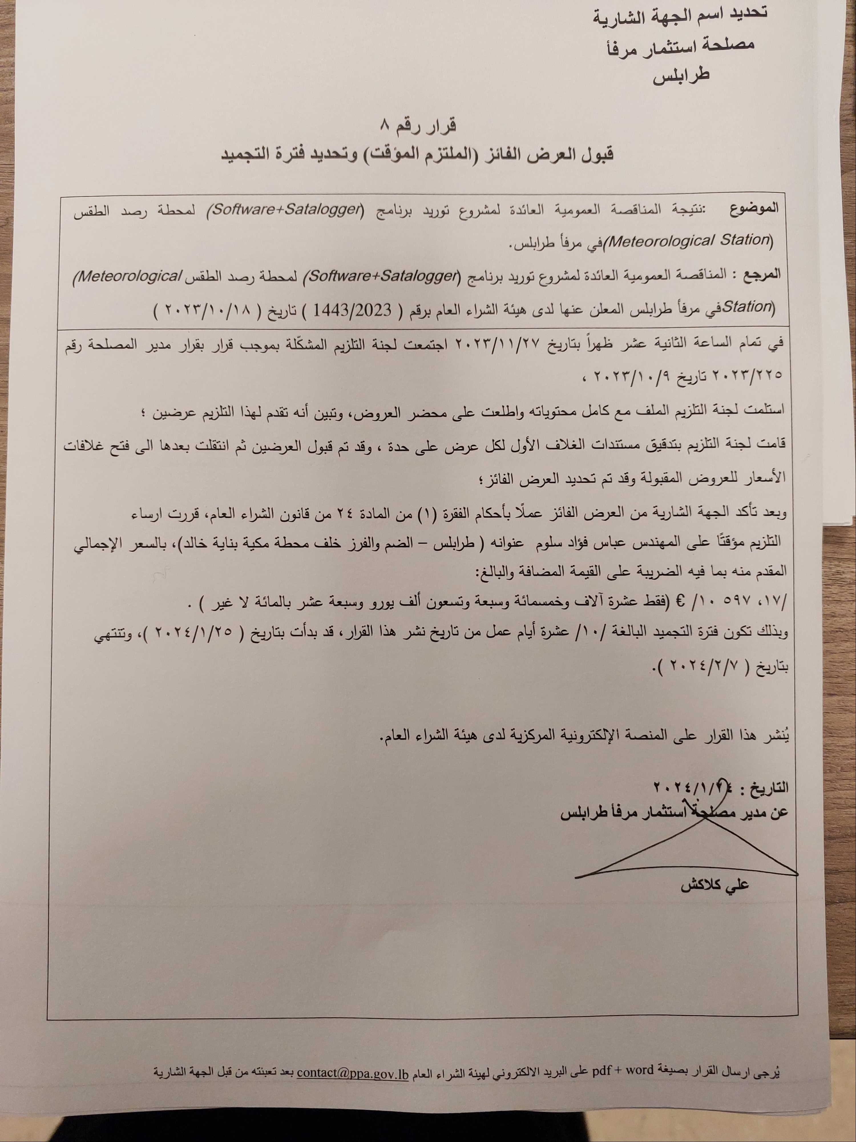 مناقصة عمومية لتلزيم توريد برنامج (Software+Satalogger) لمحطة رصد الطقس (Meteorological Station) في مرفأ طرابلس