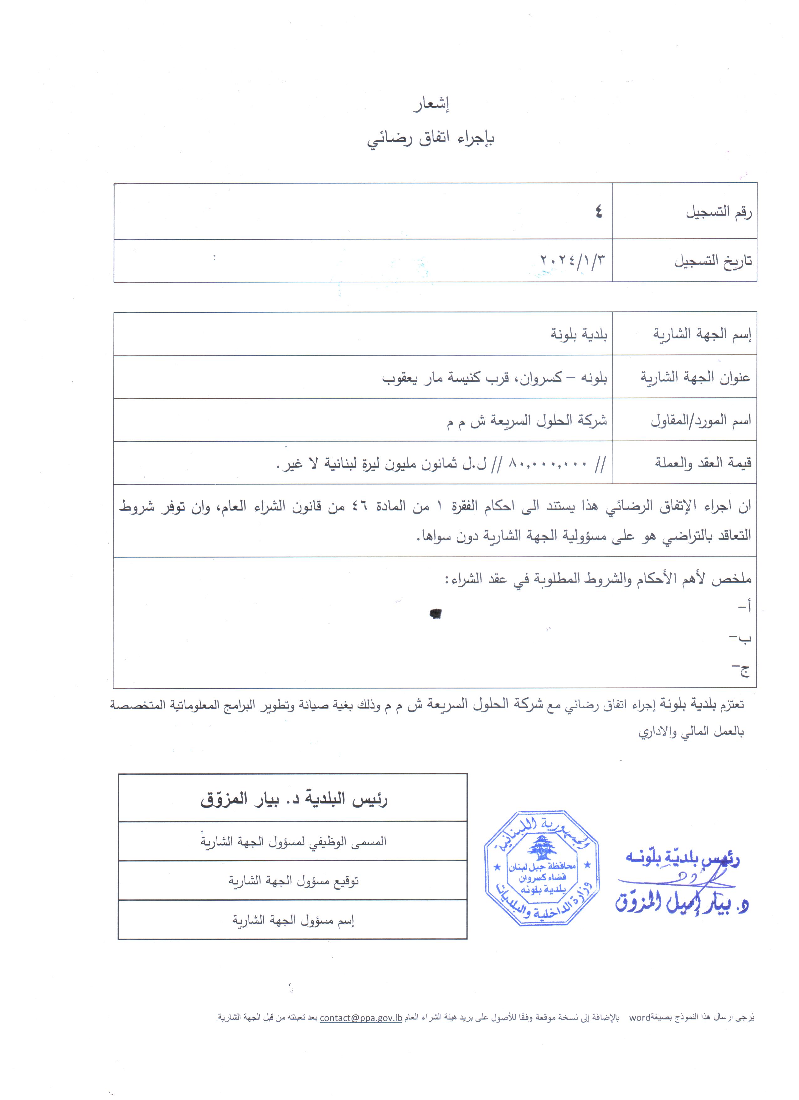 تعتزم بلدية بلونة اجراء اتفاق رضائي مع شركة الحلول السريعة ش.م.م. وذلك بغية صيانة وتطوير البرامج المعلوماتية المتخصصة بالعمل المالي والاداري