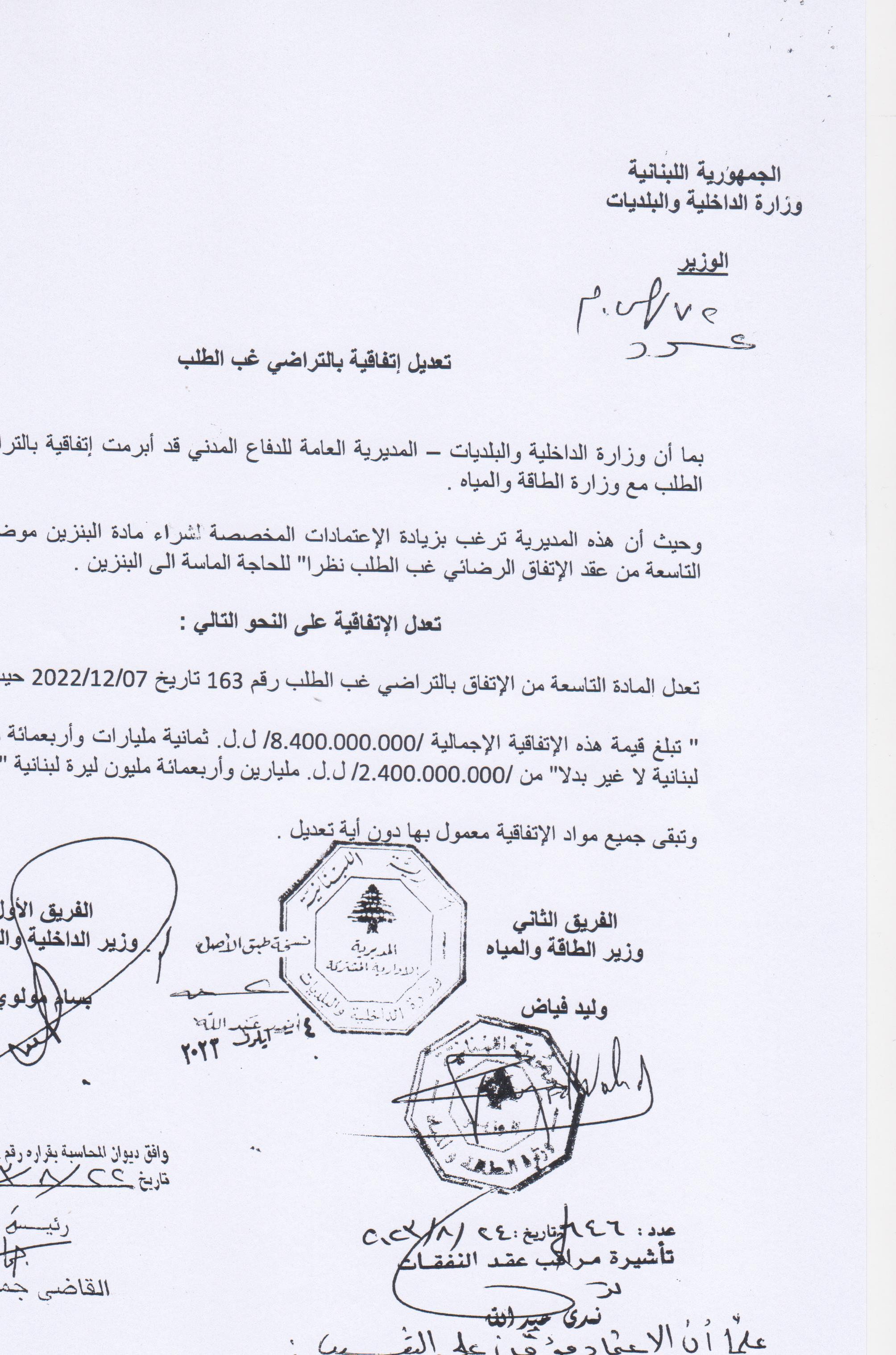 اتفاق رضائي – غب الطلب لتأمين مادة البنزين لآليات الدفاع المدني