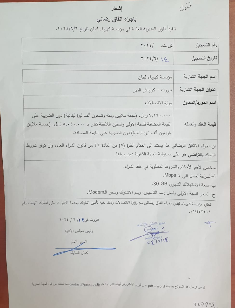 تعتزم مؤسسة كهرباء لبنان إجراء اتفاق رضائي مع وزارة الاتصالات وذلك بغية تأمين اشتراك بخدمة الانترنت على اشتراك الهاتف رقم 443419\01