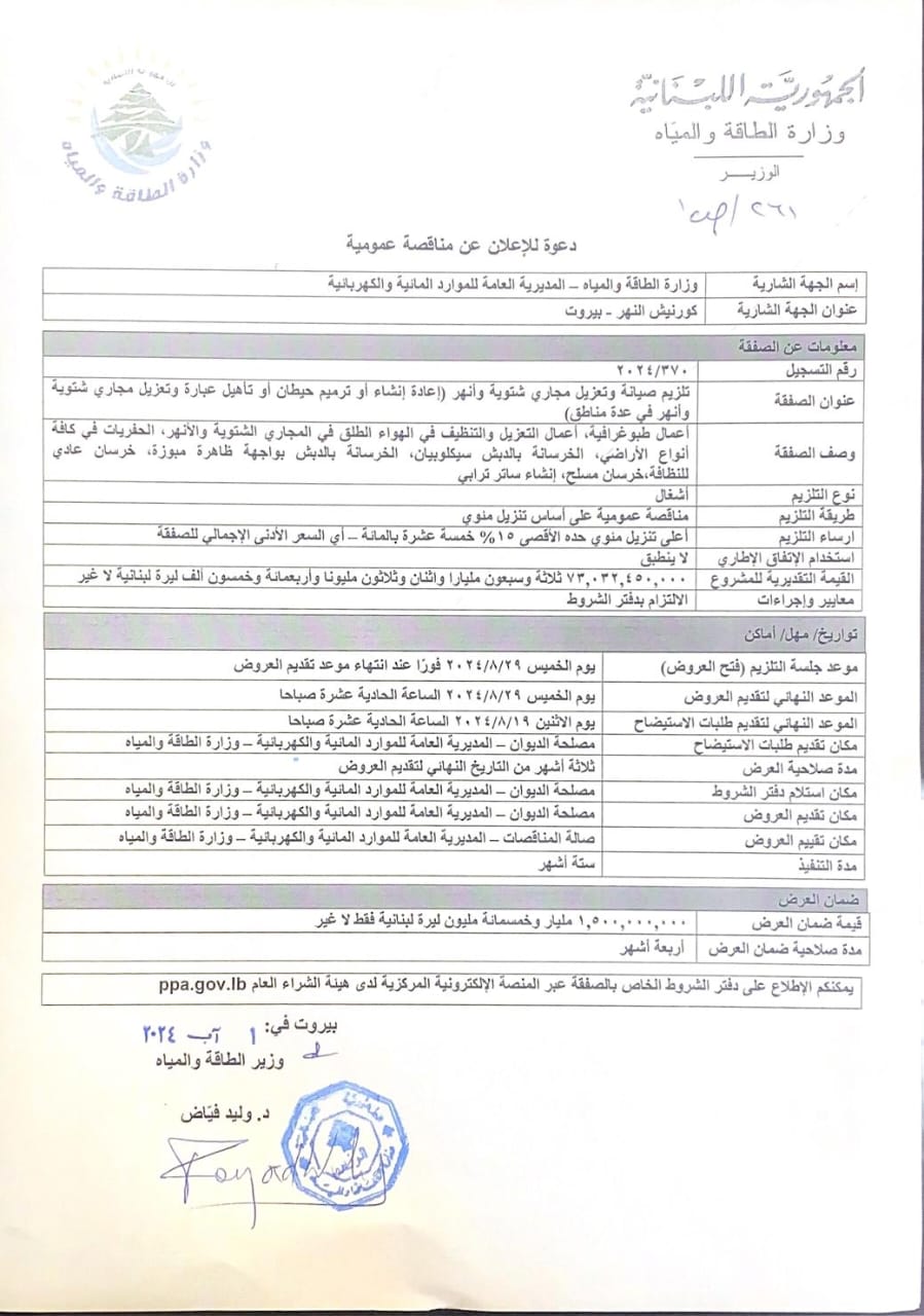 الطاقة والمياه رقم 177/ق.و تاريخ 5/8/2024، استلمت لجنة التلزيم الملف مع كامل محتوياته واطلعت على محضر