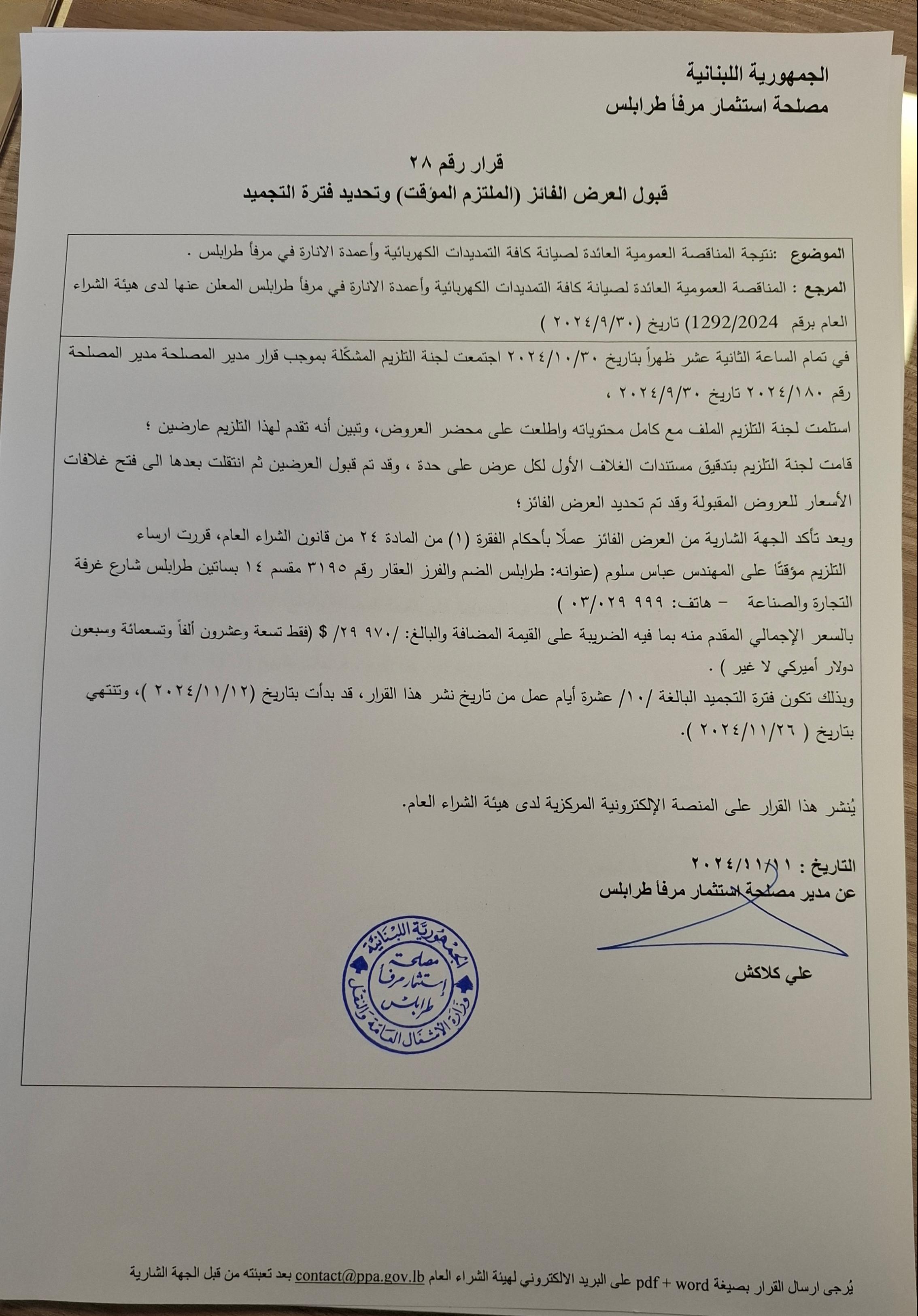 مناقصة عمومية لصيانة كافة التمديدات الكهربائية وأعمدة الانارة في مرفأ طرابلس
