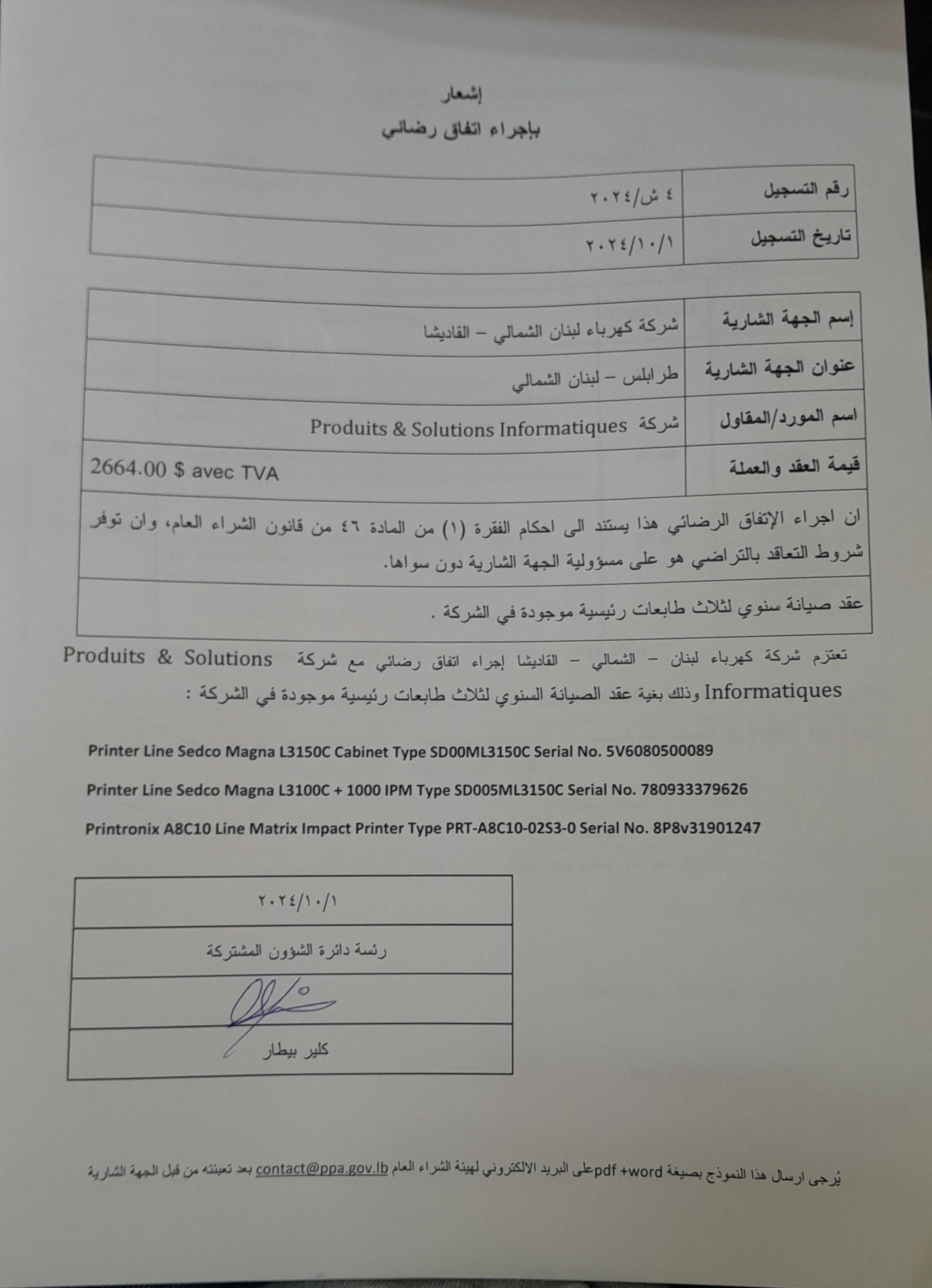 تعتزم (( شركة كهرباء لبنان الشمالي – القاديشا) إجراء اتفاق رضائي مع (Produits & Solutions Informations) وذلك بغية صيانة ثلاث طابعات رئيسية
