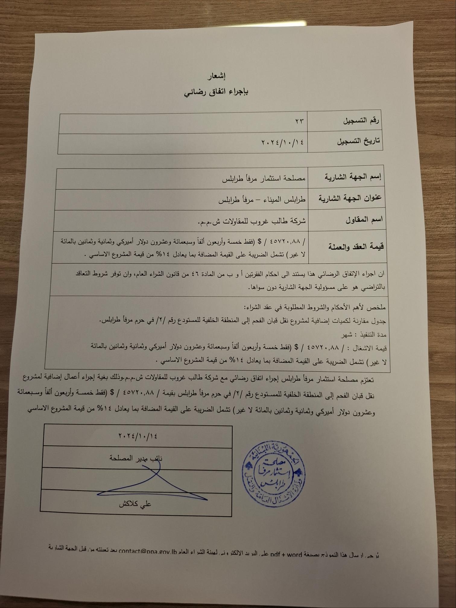 تعتزم مصلحة استثمار مرفأ طرابلس إجراء اتفاق رضائي مع شركة طالب غروب للمقاولات ش.م.م. وذلك بغية إجراء أعمال إضافية لمشروع نقل قبان الفحم إلى المنطقة الخلفية رقم /2/ في حرم مرفأ طرابلس