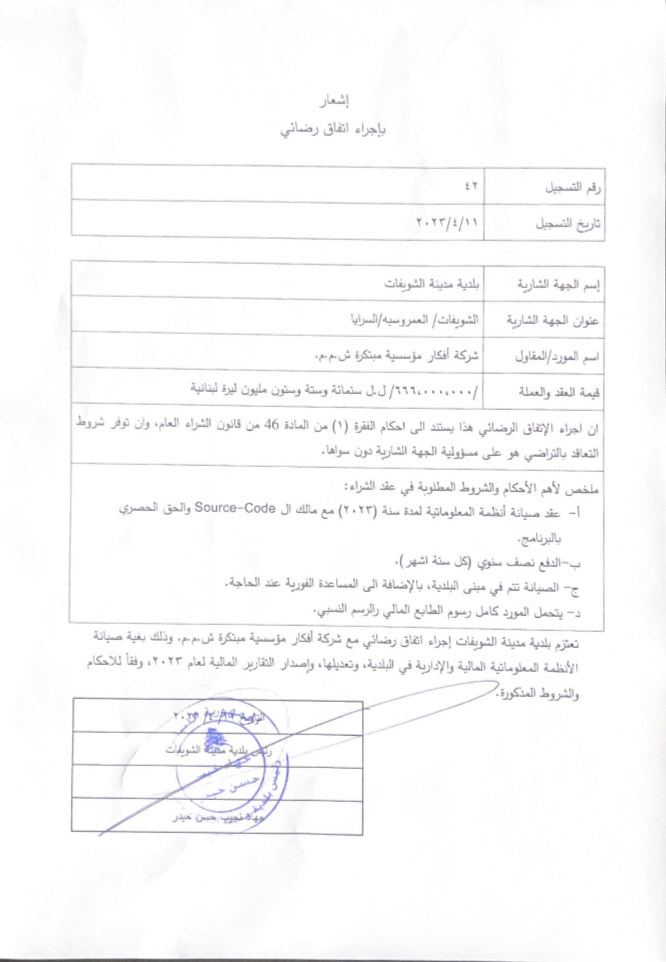 تعتزم بلدية مدينة الشويفات اجؤاء اتفاق رضائي مع شركة أفكار مؤسسة مبتكرة ش.م.م. وذلك بغية صيانة الانظمة المعلوماتية المالية والادارية في البلدية وتعديلها واصدار  التقارير المالية لعام ٢٠٢٣