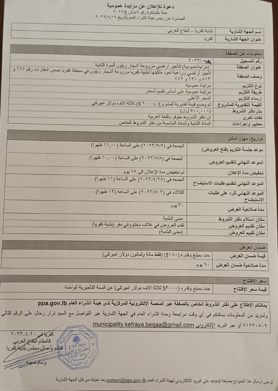 مزايدة عمومية لتأجير أراضي مزروعة أشجار زيتون لبلدية كفريا