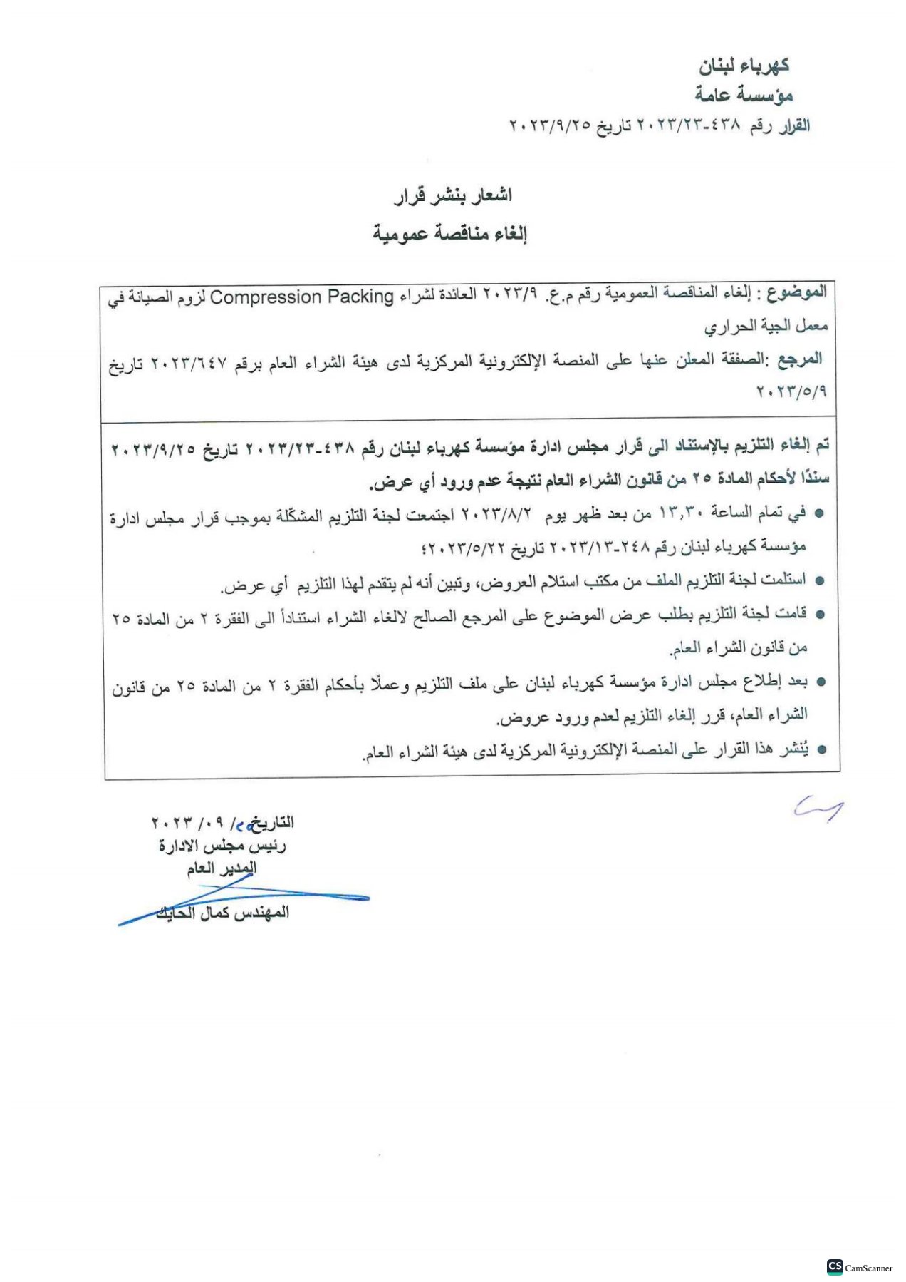 مناقصة عمومية لتلزيم شراء Compression Packing لزوم الصيانة في معمل الجية الحراري