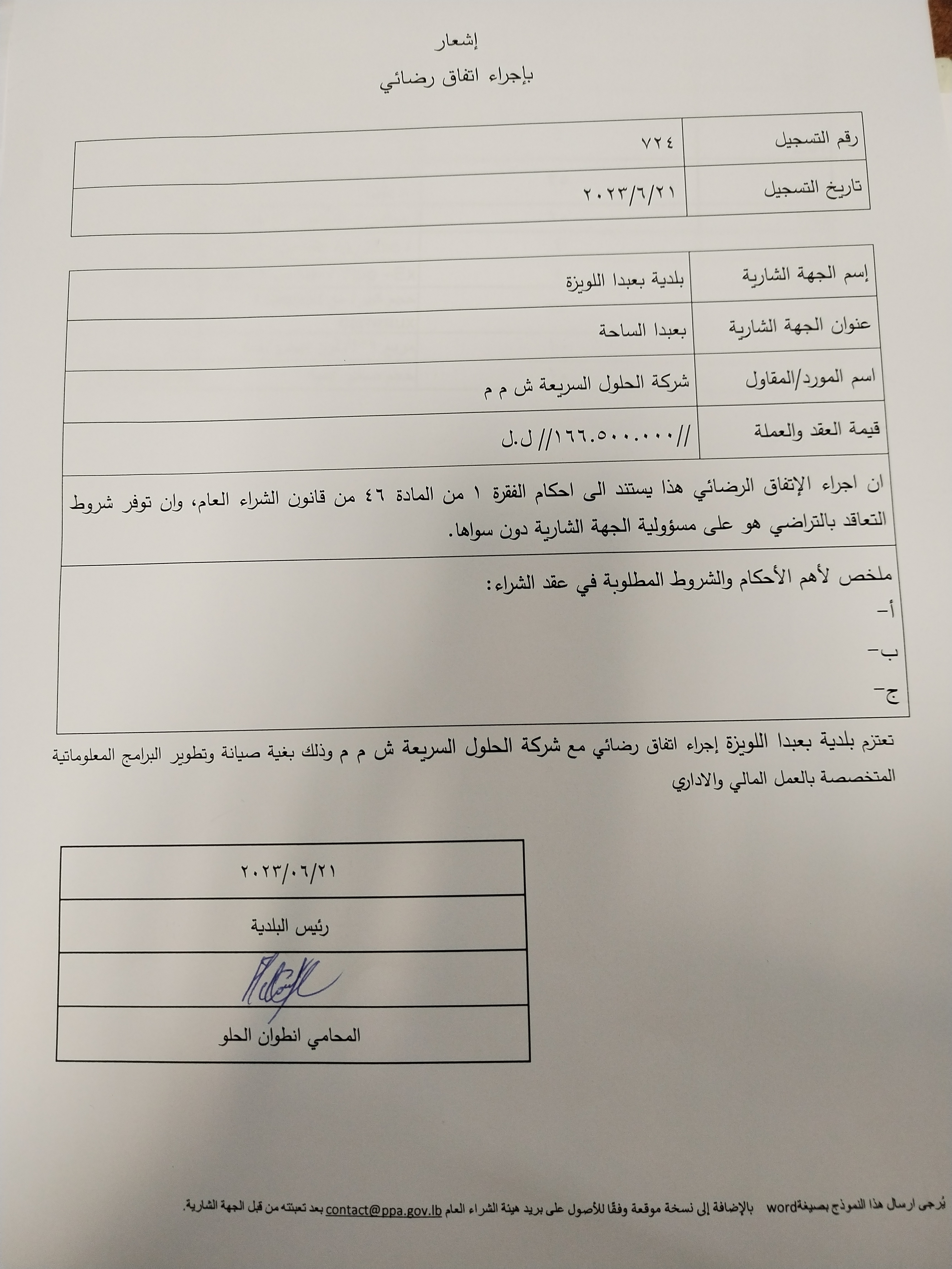تعتزم بلدية بعبدا-اللويزة أجرا اتفاق رضائي مع شركة الحلول السريعة ش.م.م. وذلك بغية صيانة وتطوير برامج المعلوماتيةالمتخصصة بالعمل المالي والاداري