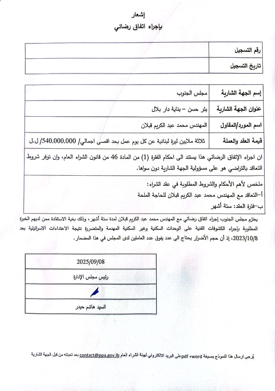 إشعار بإجراء اتفاق رضائي بين المهندس محمد عبد الكريم قبلان ومجلس الجنوب