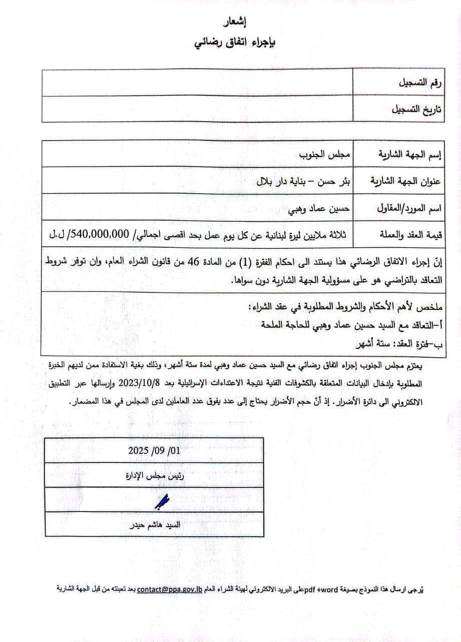 إشعار بإجراء اتفاق رضائي بين حسيت عماد وهبي ومجلس الجنوب