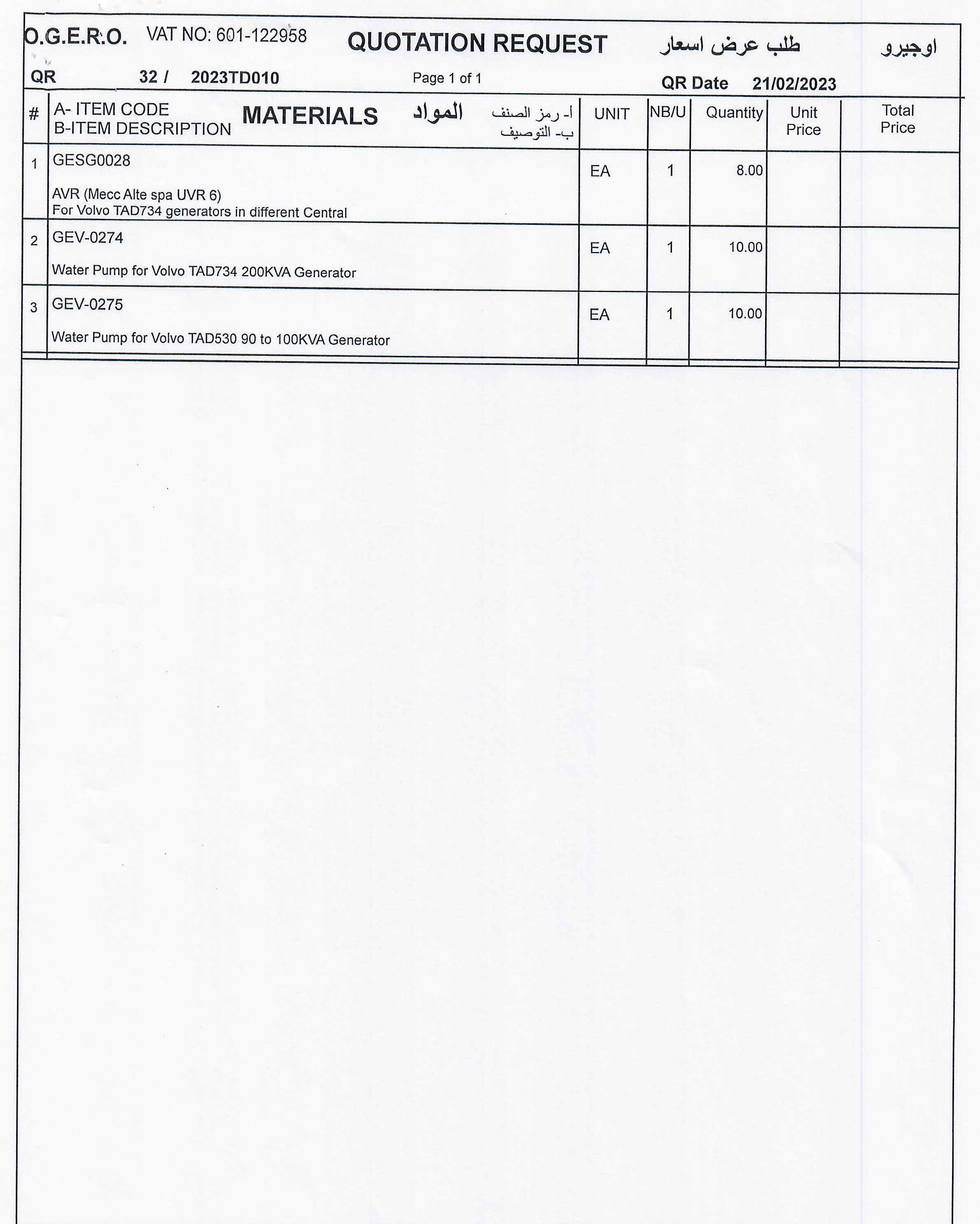 طلب عروض أسعار لتلزيم AVR AND WATER PUMPS FOR GENSETS VOLVO TAD734& TAD530 DIFFERENTS CENTRAL OFFICE(معدل)