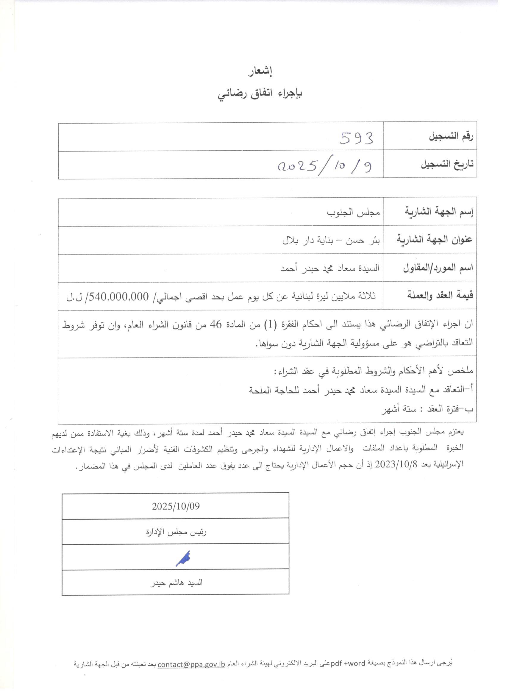 إشعار بإجراء عقد اتفاق رضائي بين سعاد محمد حيدر أحمد ومجلس الجنوب