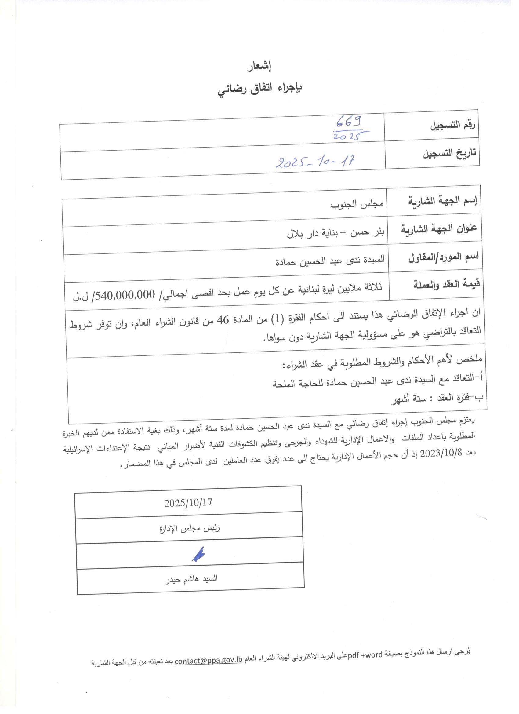 إشعار بإجراء اتفاق رضائي بين ندى عبد الحسين حمادة ومجلس الجنوب
