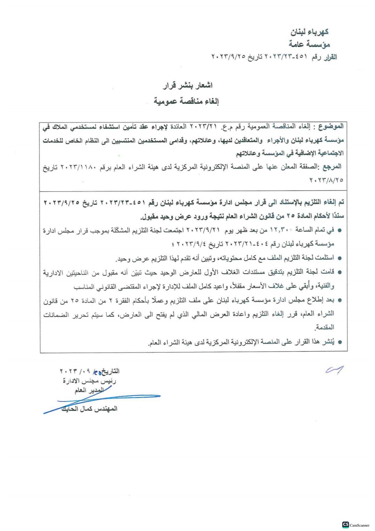 مناقصة عمومية لإجــــــراء عقــــد تأميــن استشفاء لمستخدمي الملاك في مؤسسة كهرباء لبنان والأجراء والمتعاقدين لديها، وعائلاتهم، وقدامى المستخدمين المنتسبين الى النظام الخاص للخدمات الاجتماعية الإضافية في المؤسسة وعائلاتهم