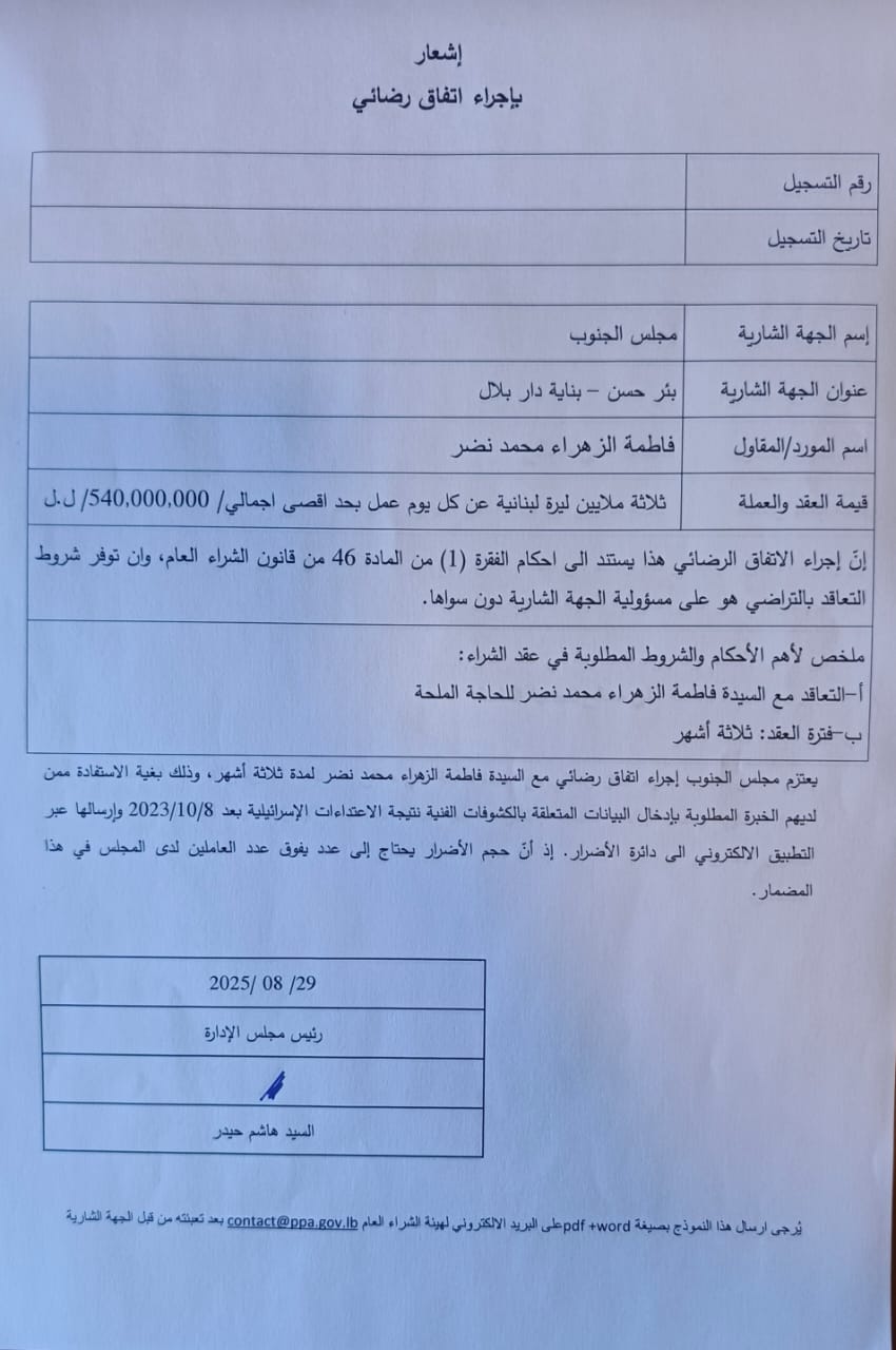مذكرة رقم 6/ه.ش.ع./٢٠٢٦ موجَّهة إلى كافَّة الجهات الخاضعة لأحكام قانون الشراء العام بموضوع تنظيم عقد بين الجهة الشارية والملتزم المؤقت