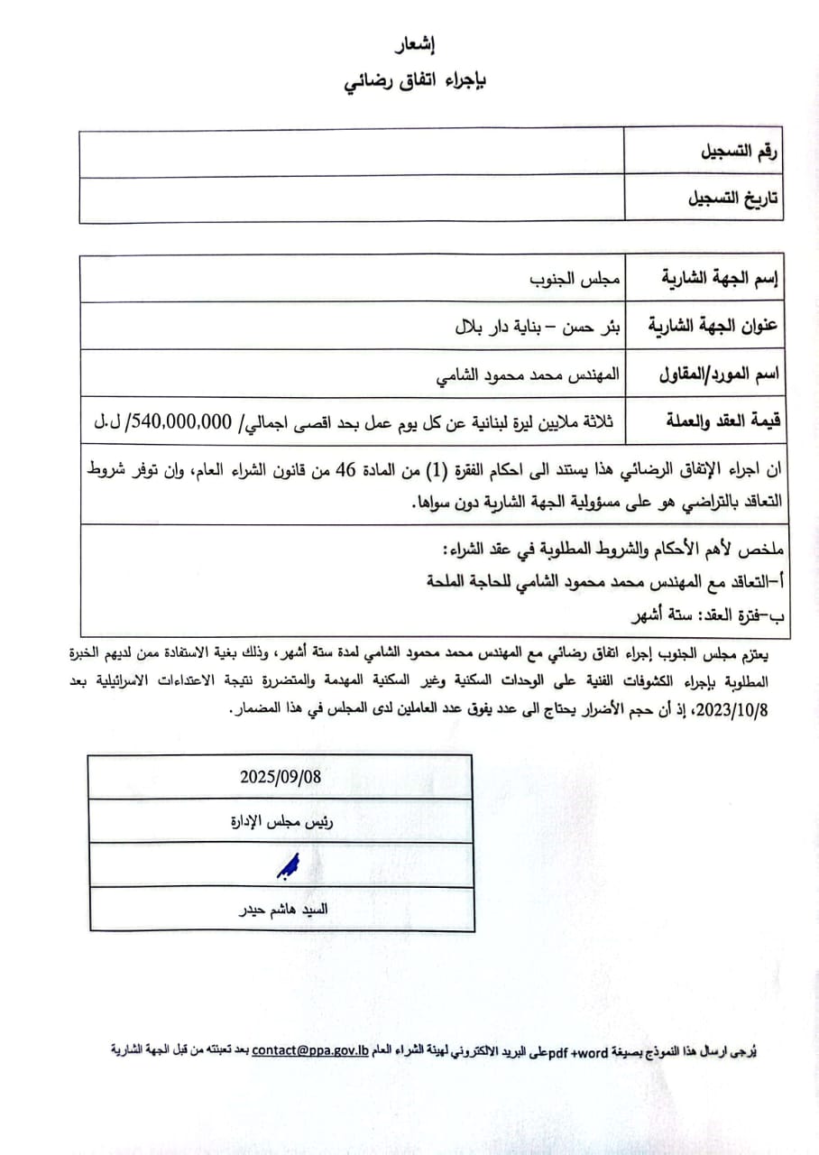 مذكرة رقم 6/ه.ش.ع./٢٠٢٦ موجَّهة إلى كافَّة الجهات الخاضعة لأحكام قانون الشراء العام بموضوع تنظيم عقد بين الجهة الشارية والملتزم المؤقت