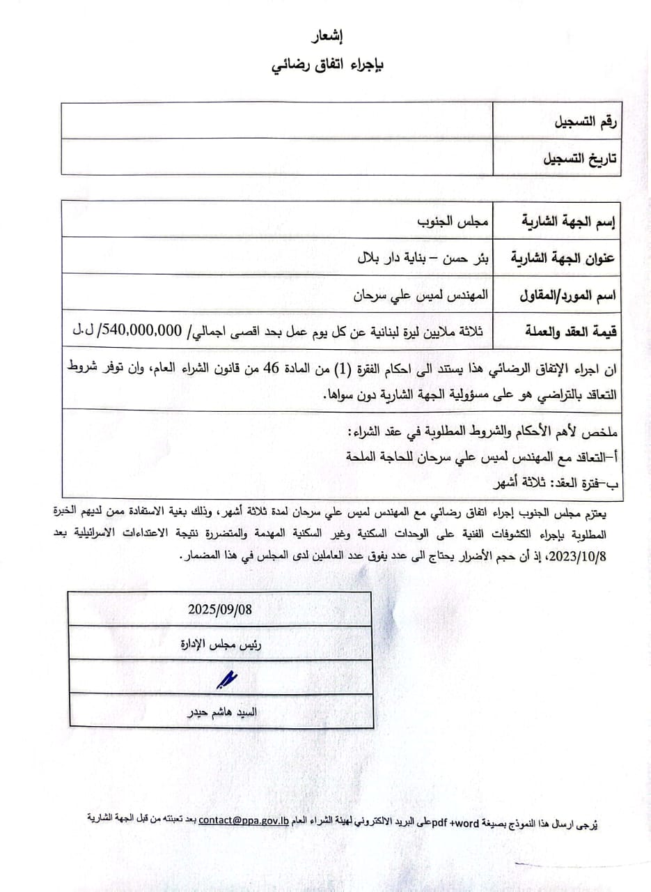 مذكرة رقم 6/ه.ش.ع./٢٠٢٦ موجَّهة إلى كافَّة الجهات الخاضعة لأحكام قانون الشراء العام بموضوع تنظيم عقد بين الجهة الشارية والملتزم المؤقت