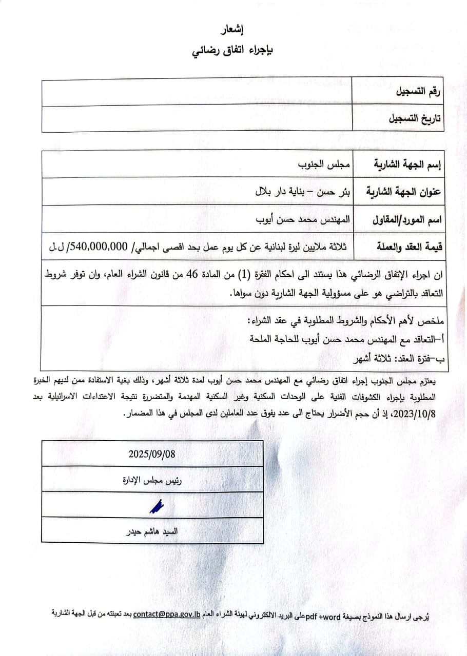 مذكرة رقم 6/ه.ش.ع./٢٠٢٦ موجَّهة إلى كافَّة الجهات الخاضعة لأحكام قانون الشراء العام بموضوع تنظيم عقد بين الجهة الشارية والملتزم المؤقت