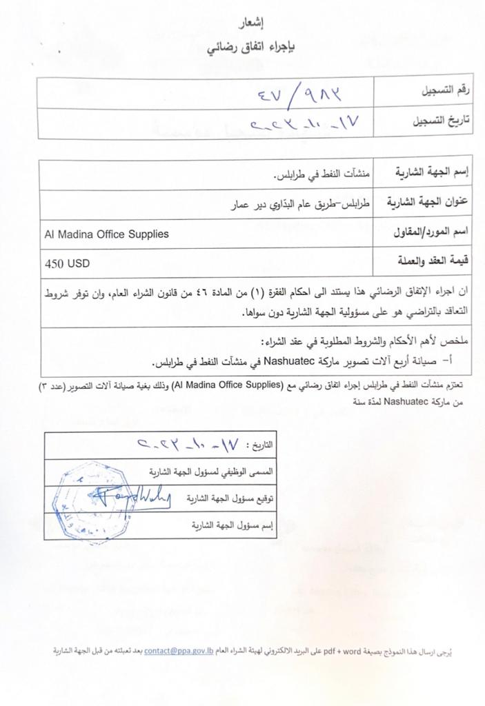مذكرة رقم 6/ه.ش.ع./٢٠٢٦ موجَّهة إلى كافَّة الجهات الخاضعة لأحكام قانون الشراء العام بموضوع تنظيم عقد بين الجهة الشارية والملتزم المؤقت