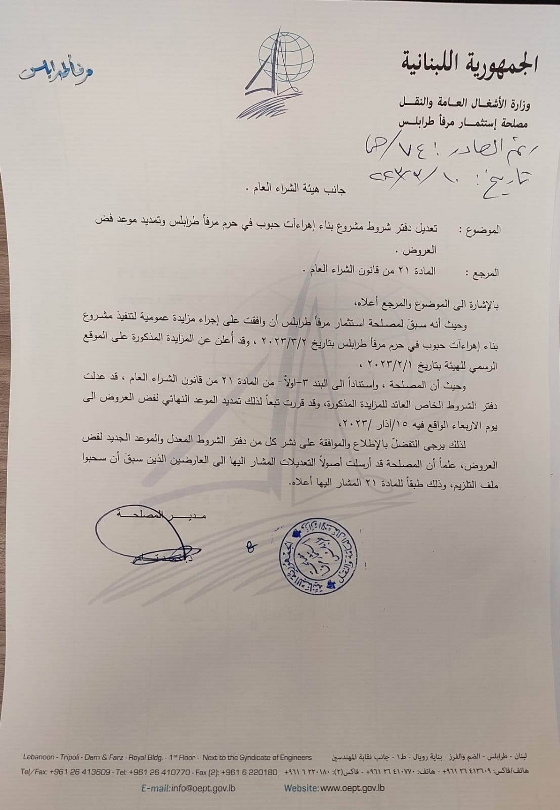 مذكرة رقم 6/ه.ش.ع./٢٠٢٦ موجَّهة إلى كافَّة الجهات الخاضعة لأحكام قانون الشراء العام بموضوع تنظيم عقد بين الجهة الشارية والملتزم المؤقت