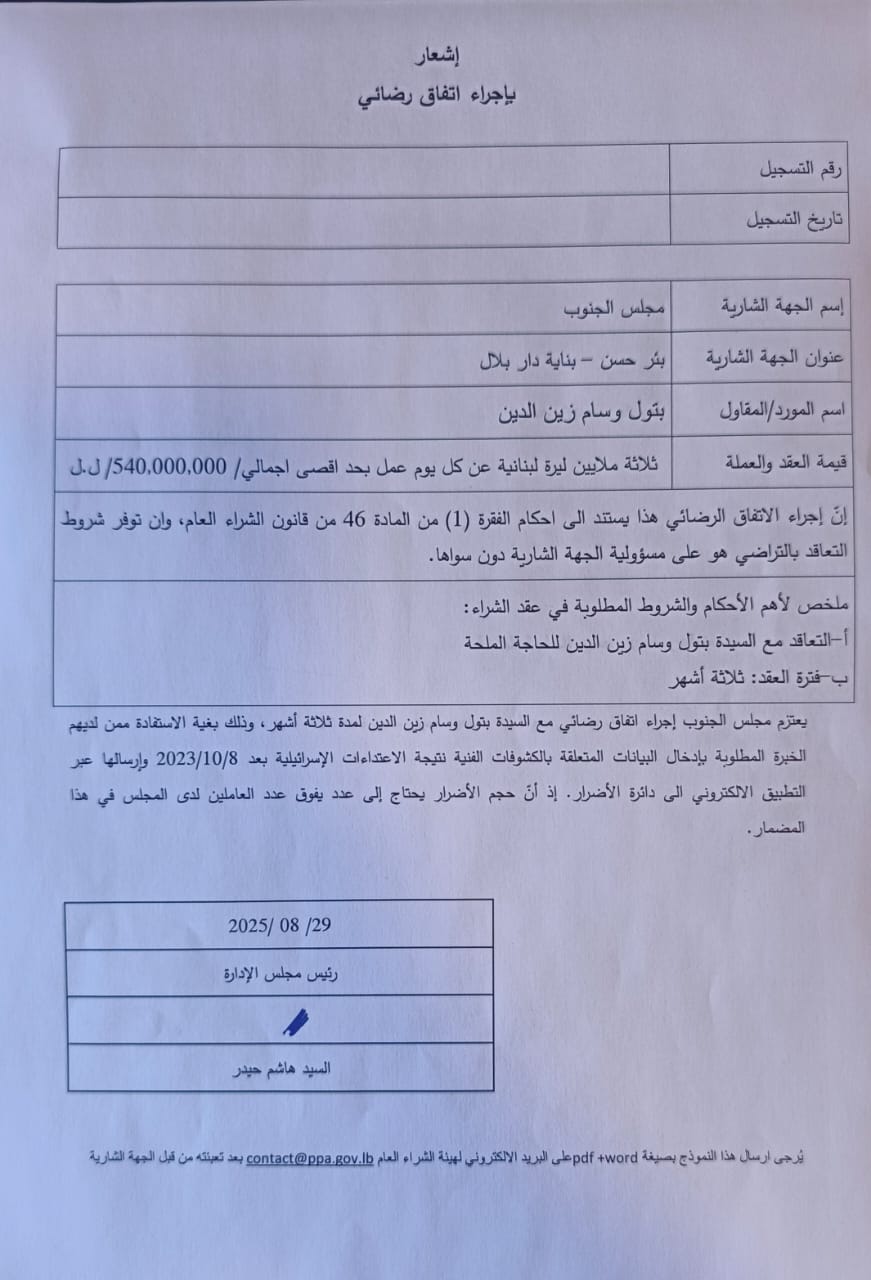 مذكرة رقم 6/ه.ش.ع./٢٠٢٦ موجَّهة إلى كافَّة الجهات الخاضعة لأحكام قانون الشراء العام بموضوع تنظيم عقد بين الجهة الشارية والملتزم المؤقت